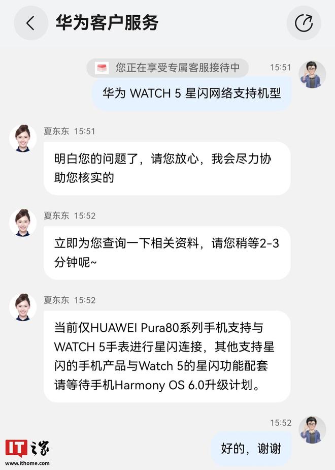 IT之家咨询华为客户服务获悉,当前仅 HUAWEI Pura80 系列手机支持与 WATCH 5 手表进行星闪连接,其他支持星闪的手机产品与 WATCH 5 的星闪功能配套需等待手机 HarmonyOS 6.0 升级计划。